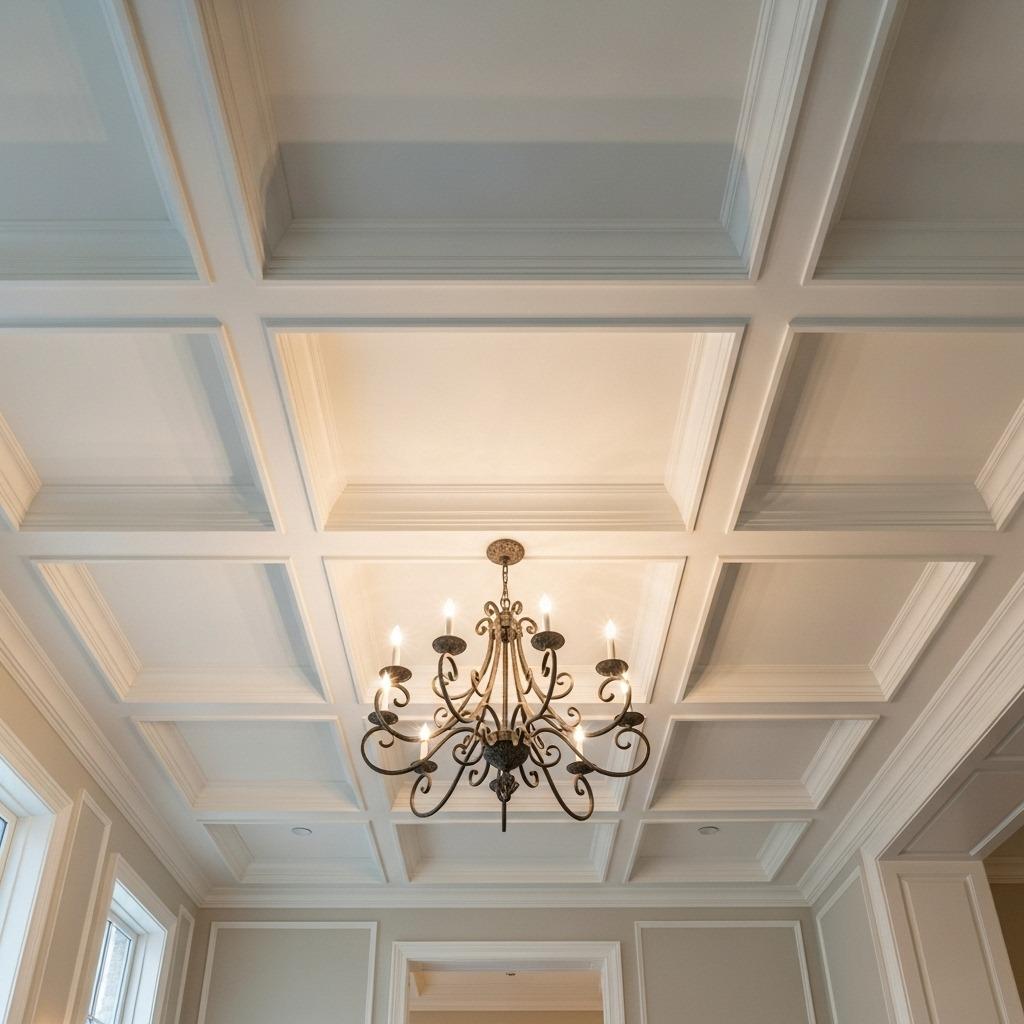 I haven’t tackled this one yet personally (it’s on my list), but I’ve studied countless tutorials. The basic principle involves creating recessed boxes on your ceiling using beams, then running crown molding where ceiling meets wall to tie everything together.