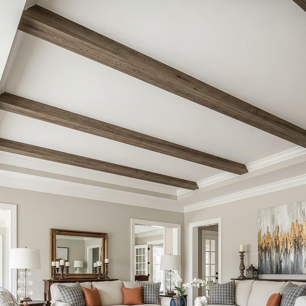 This works beautifully in open concept spaces where you want to define zones without walls. Run faux beams perpendicular to your longest wall, then install crown molding around the perimeter that ties into the beams.