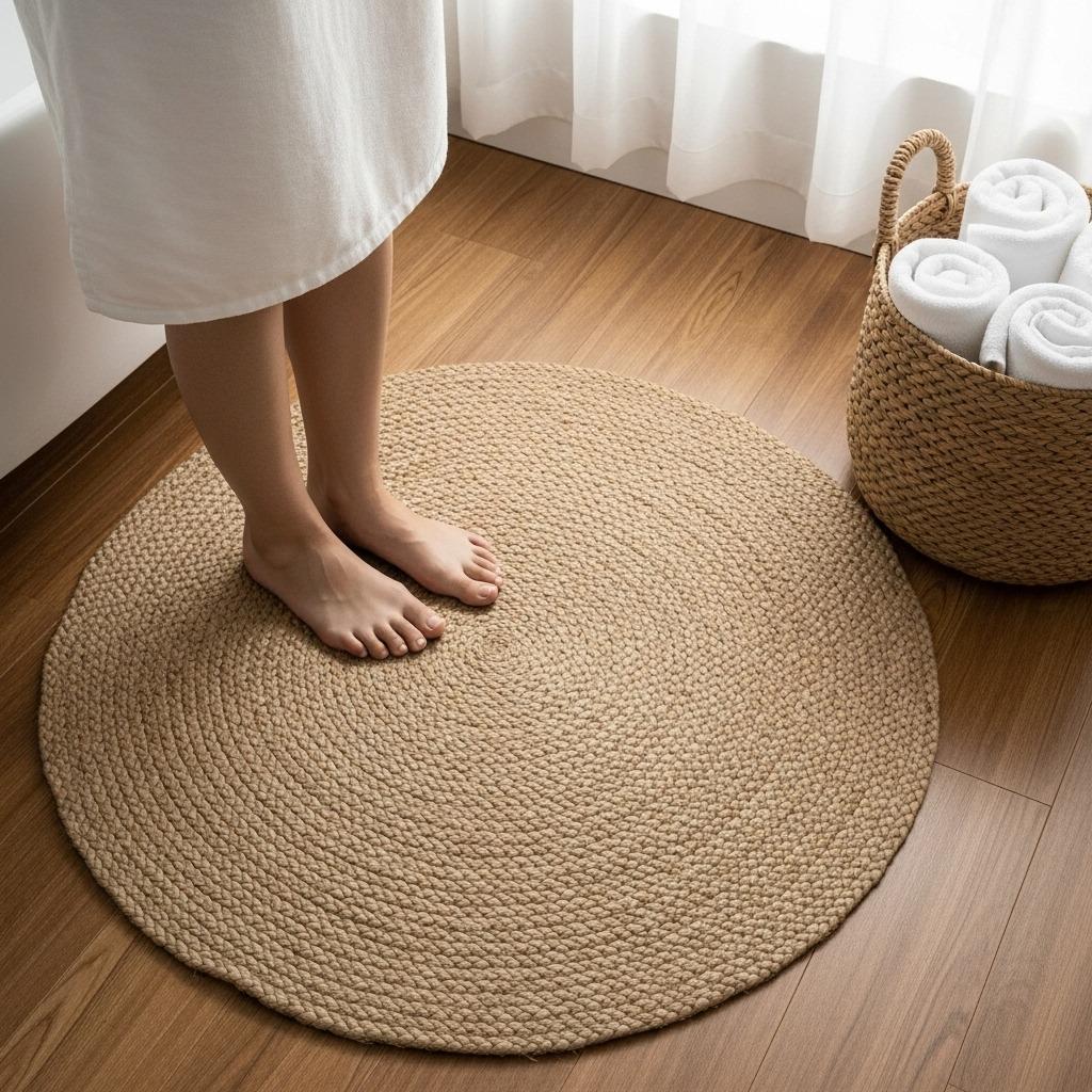 Layer a jute rug over tile or wood floors to define spaces within your bathroom. Place one beside the tub for a spa-like stepping stone, or use a larger runner to warm up the vanity area. The organic weave adds visual interest without demanding attention.