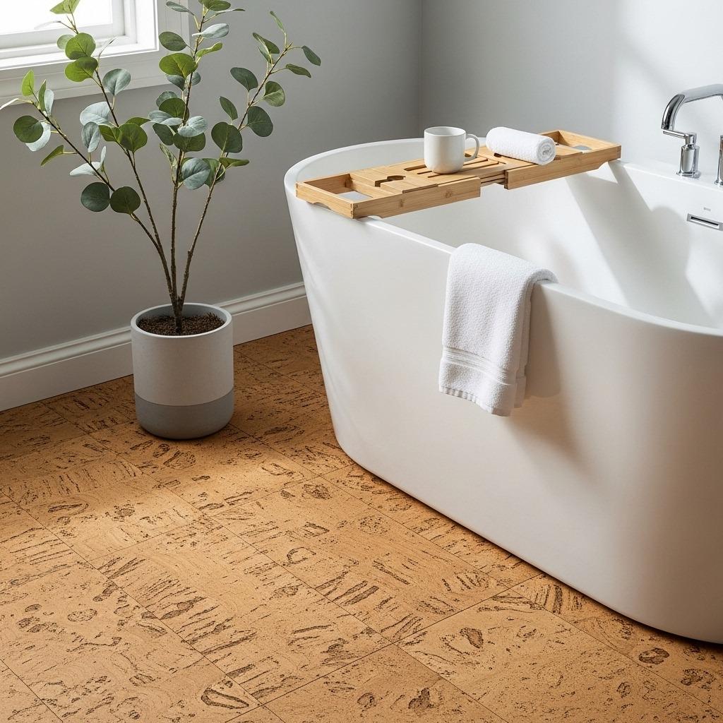 The honey and tan tones of natural cork bring instant earthiness. Modern cork tiles come in various patterns and shades, from classic cork texture to more uniform appearances. They’re water-resistant when properly sealed, making them practical for bathroom applications.