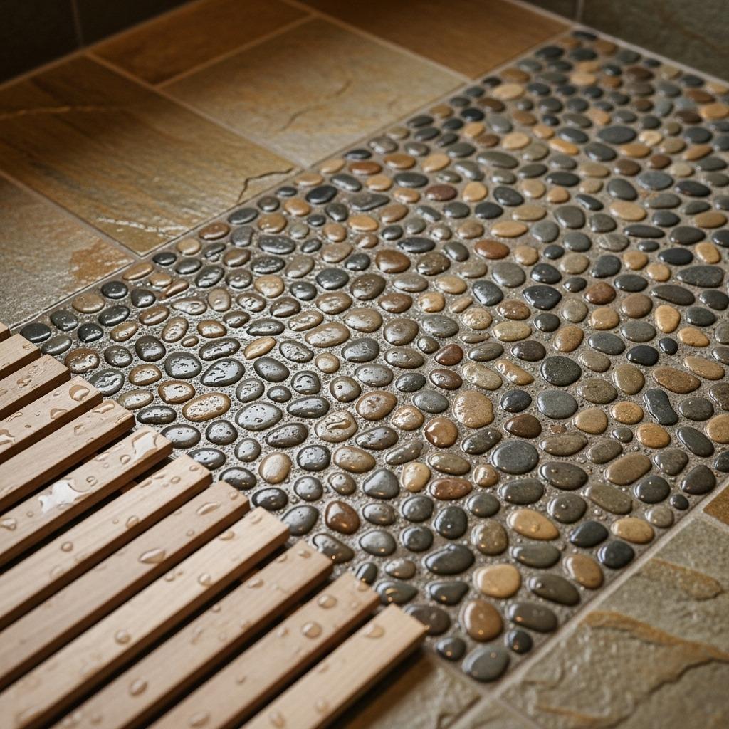 Maintenance is simpler than you’d think. Sealed properly, pebble floors resist mold and are easy to clean. They pair beautifully with larger natural stone tiles on the walls, creating a graduated texture that guides the eye naturally.