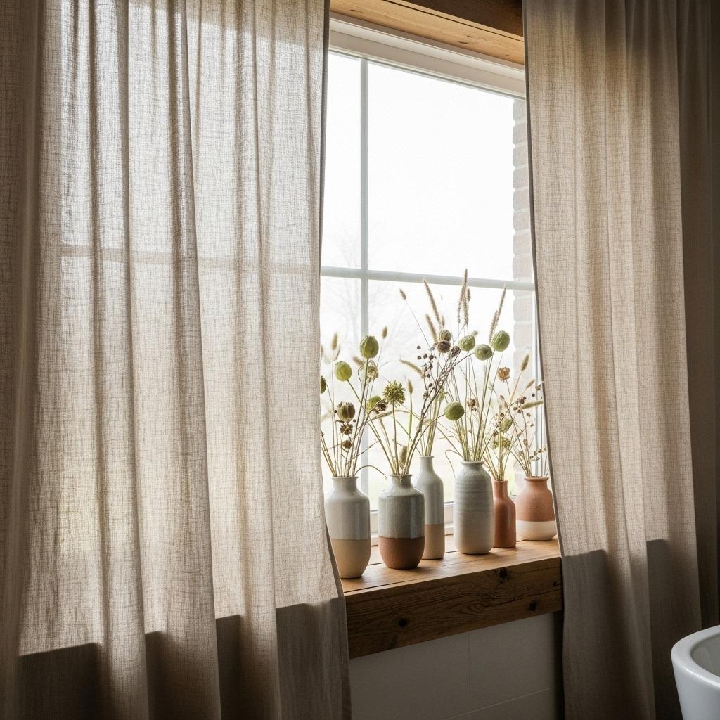 Choose undyed linens in their natural beige or cream tones for authentic earthiness. The subtle texture catches light beautifully throughout the day, creating movement and interest. Linen also manages moisture well, making it practical for bathroom environments.