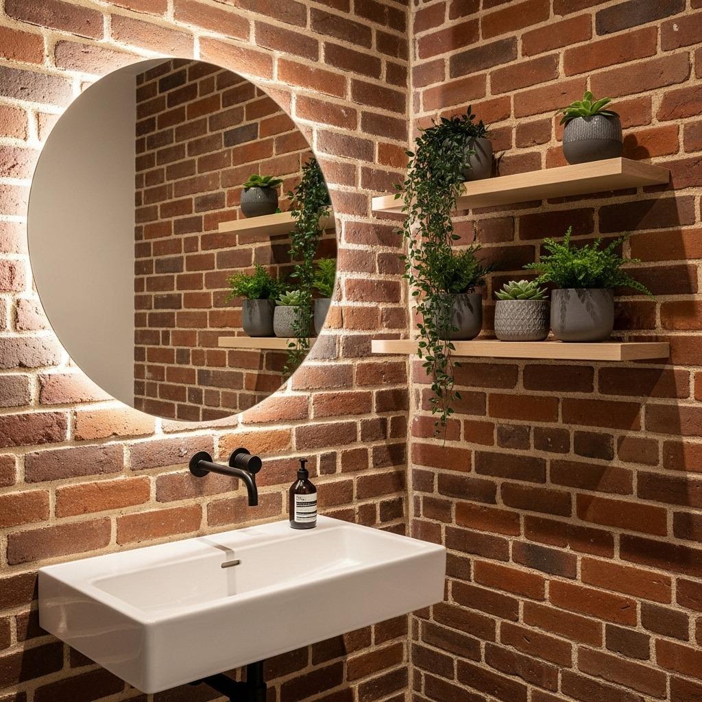 Seal the brick to protect against moisture while maintaining its natural appearance. The earthy reds, oranges, and browns coordinate perfectly with other organic materials like wood and stone. This works especially well in industrial loft bedrooms that extend into en-suite bathrooms.