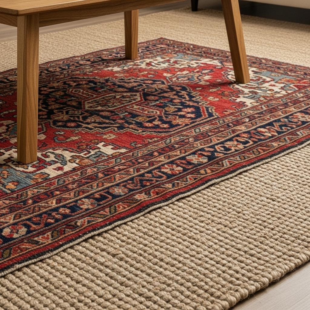 The contrast between textures matters just as much as the patterns. A rough natural fiber rug paired with a plush vintage Persian creates a tactile experience that makes the space feel collected over time. You can shift the top rug seasonally or swap it when you need a refresh.