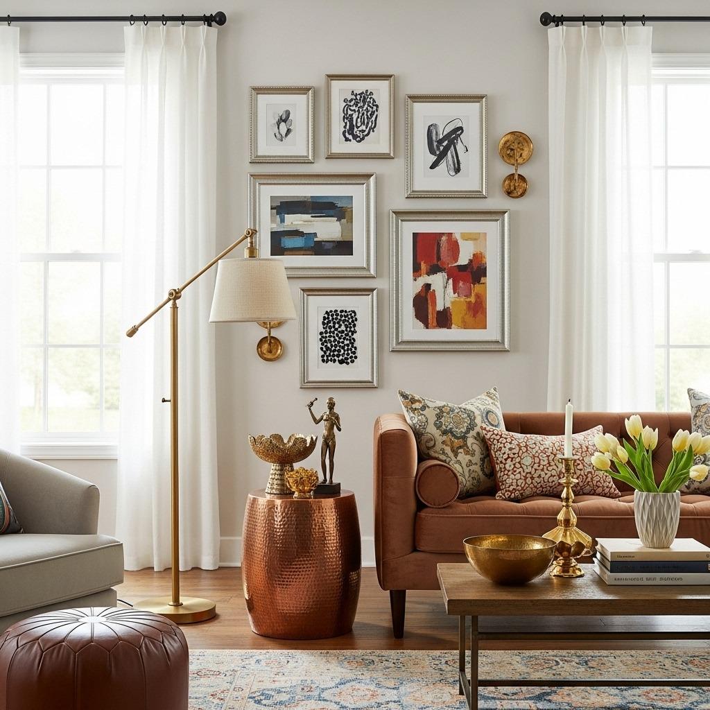 Multiple metallic finishes add richness to an eclectic living room. Gold, brass, copper, silver, and black metal can all exist in the same space when you distribute them evenly. Avoid clustering all your brass on one side and all your silver on the other.