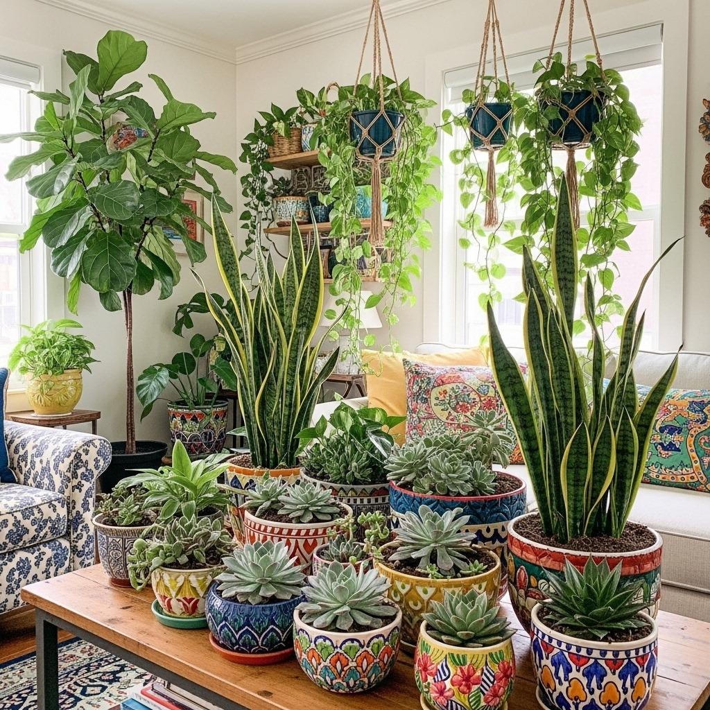 Plants breathe life into an eclectic space and unify disparate elements through their organic presence. Mix plant varieties and heights – a tall fiddle leaf fig, medium-height snake plants, and trailing pothos create vertical interest. The varying shades of green provide a neutral backdrop for your bold design choices.