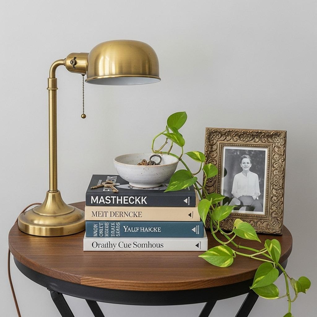 Follow the rule of three (or five, or seven – odd numbers work best). Group a lamp, plant, and decorative object, or stack books with a small sculpture on top and a candle beside them. These collections feel curated rather than cluttered when you use odd-numbered groupings.