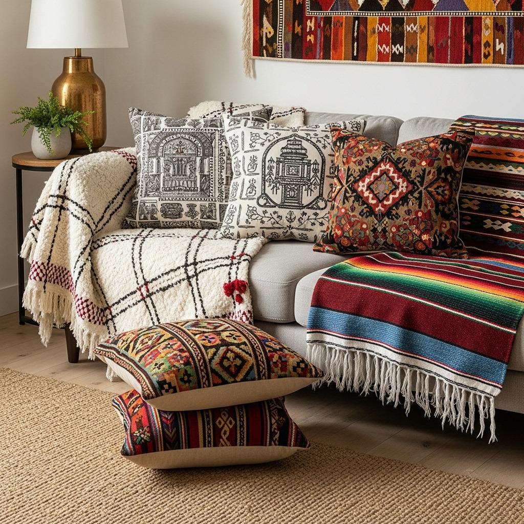 Layer different textile traditions without worrying about them “matching” in the traditional sense. A Guatemalan woven throw can absolutely sit on a sofa with African mudcloth pillows if they share complementary colors. The handmade quality creates its own harmony.