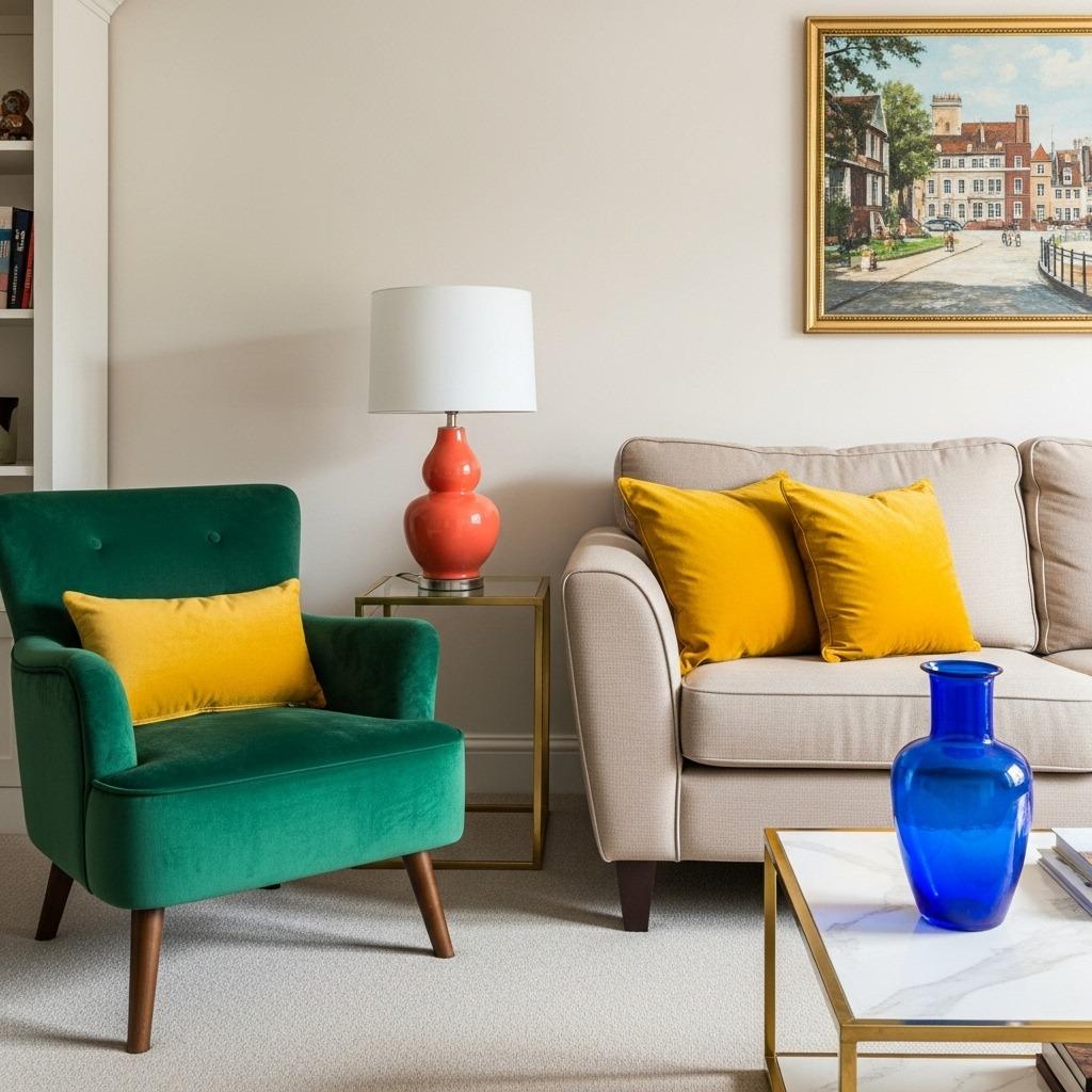 Strategic color pops bring life to an eclectic space without overwhelming it. Keep your major pieces neutral, then inject personality through accessories you can easily change. A bold emerald chair, coral lamp, or cobalt vase becomes a focal point against a calmer backdrop.
