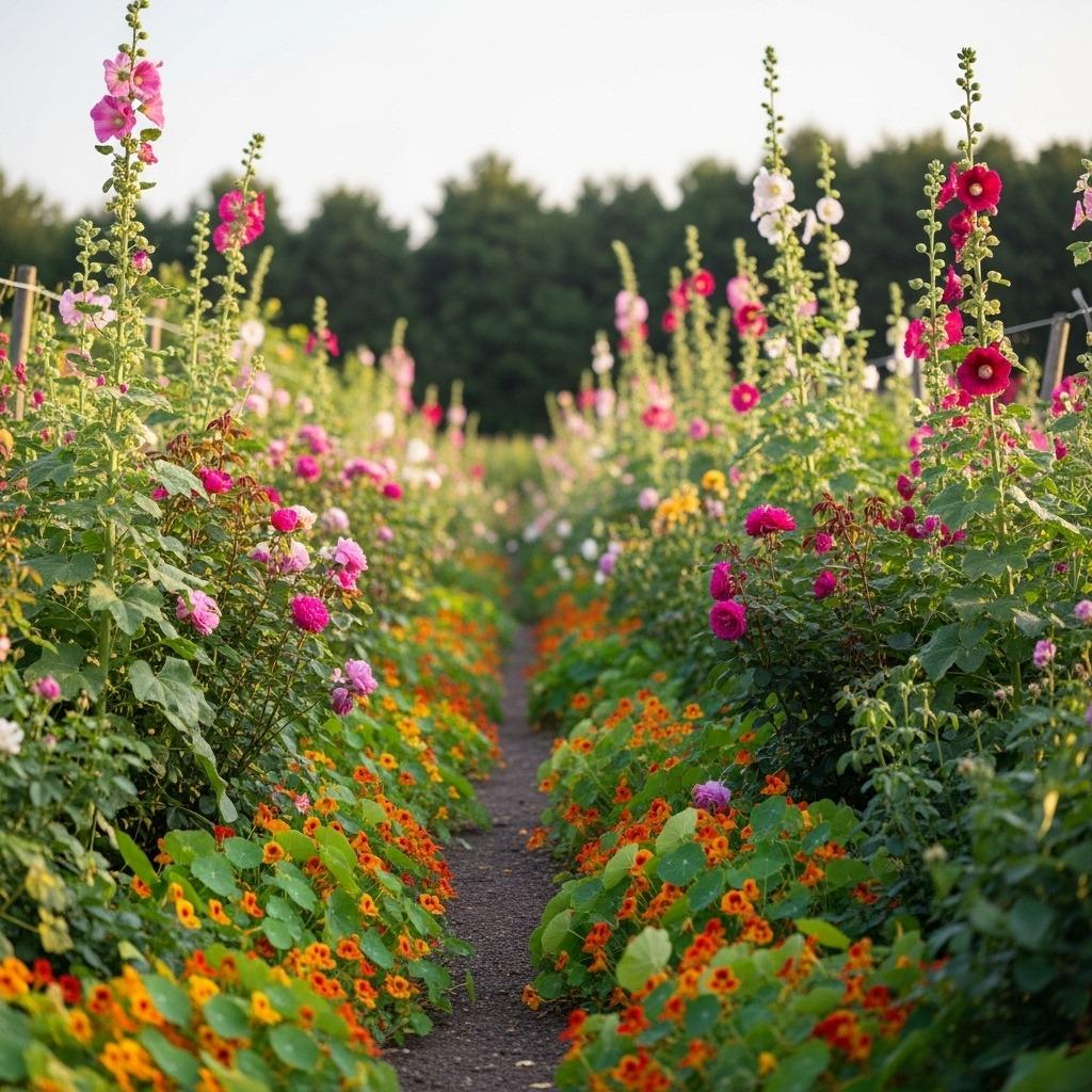 Think about layering different heights and textures. Tall hollyhocks and sunflowers create the backdrop, while mid-height roses and calendula fill the middle ground. Low-growing nasturtiums and violas cascade along the edges, creating that quintessential cottage garden look. The informal, slightly wild appearance actually works in your favor – it’s hard to mess this up.