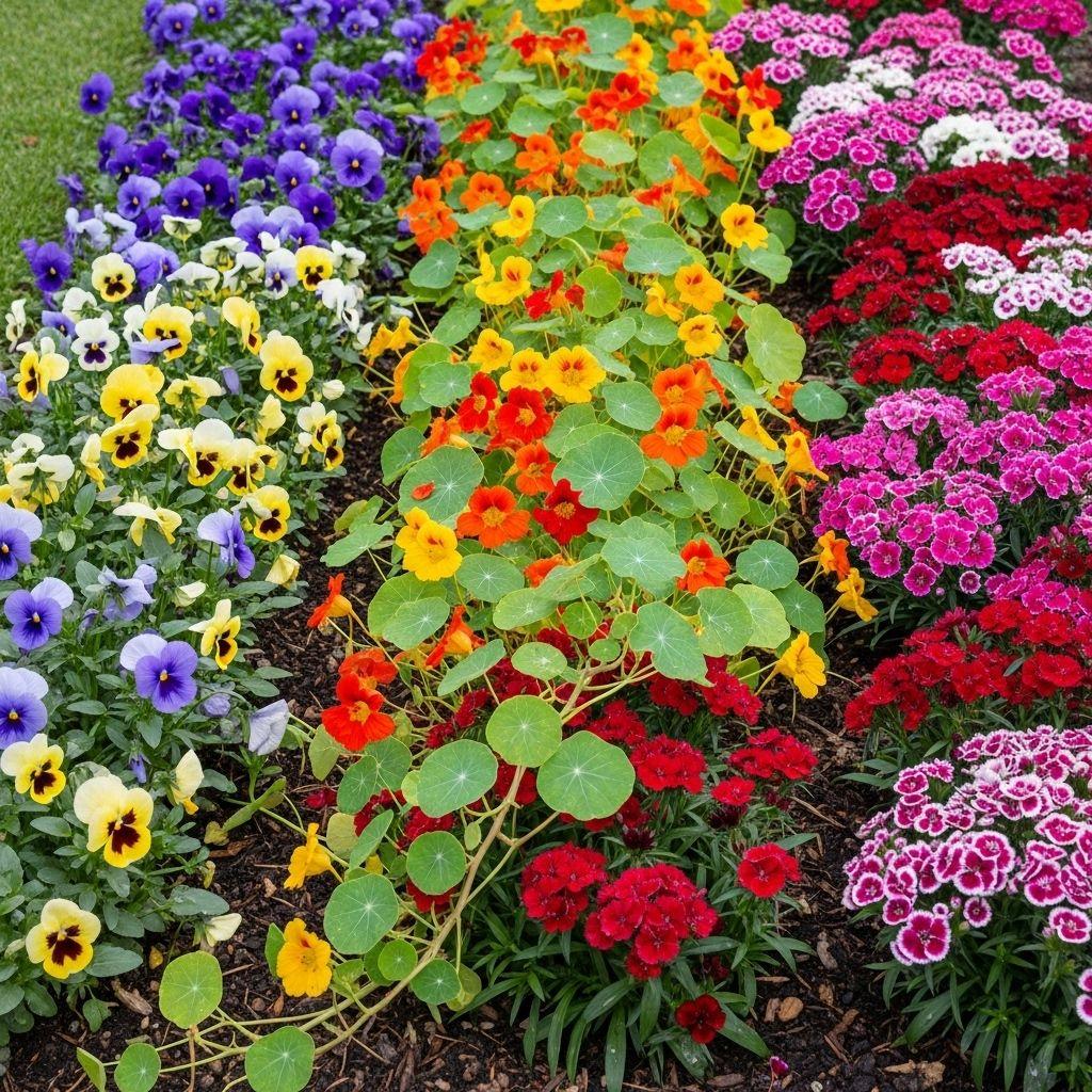 Start with early bloomers like violas and primroses that can handle cool spring temperatures. Transition to heat-lovers like nasturtiums, zinnias, and marigolds for summer. As temperatures cool, pansies and dianthus take over again, often blooming until hard frost. In mild climates, some varieties might even produce through winter.