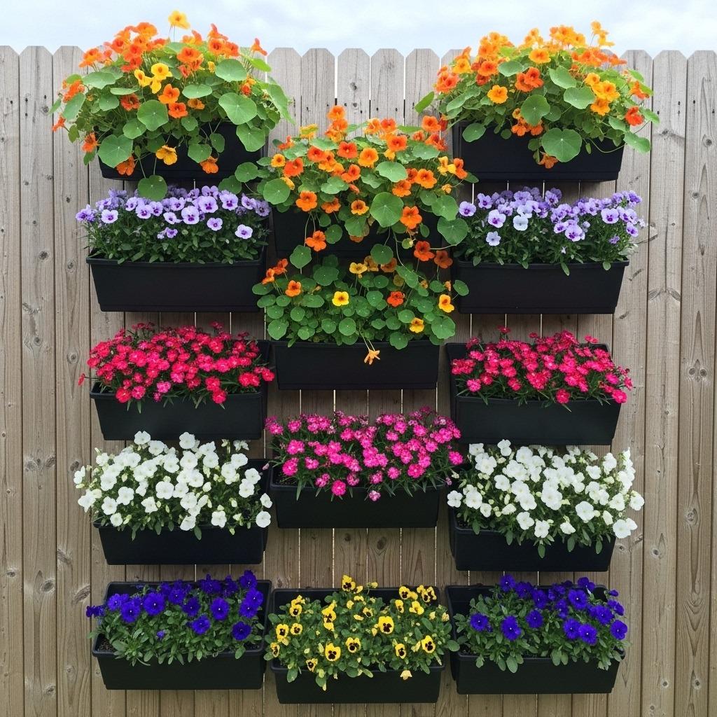 Use wall-mounted planters, hanging pockets, or even repurposed pallets to create tiers of growing space. Trailing nasturtiums work particularly well in upper sections where they can cascade down. Place more upright growers like violas and dianthus in middle and lower sections. This creates natural movement and prevents any one variety from blocking light to others.