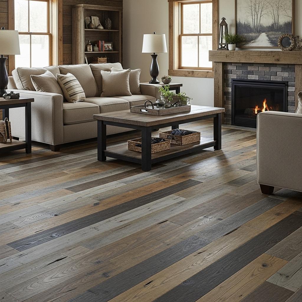 Reclaimed wood brings instant character and history to your floors. Each plank tells a story through its weathering, nail holes, and color variation. The aged patina you get with reclaimed wood would take decades to develop on new flooring.