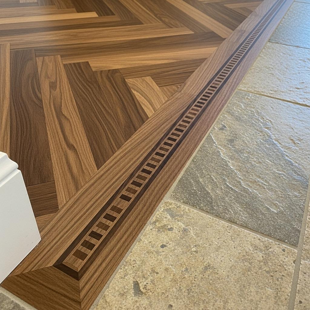 Sometimes the best flooring refresh isn’t about changing the floor itself – it’s about how you frame and transition between different flooring materials. Quality transition strips and decorative borders create polish and intention.