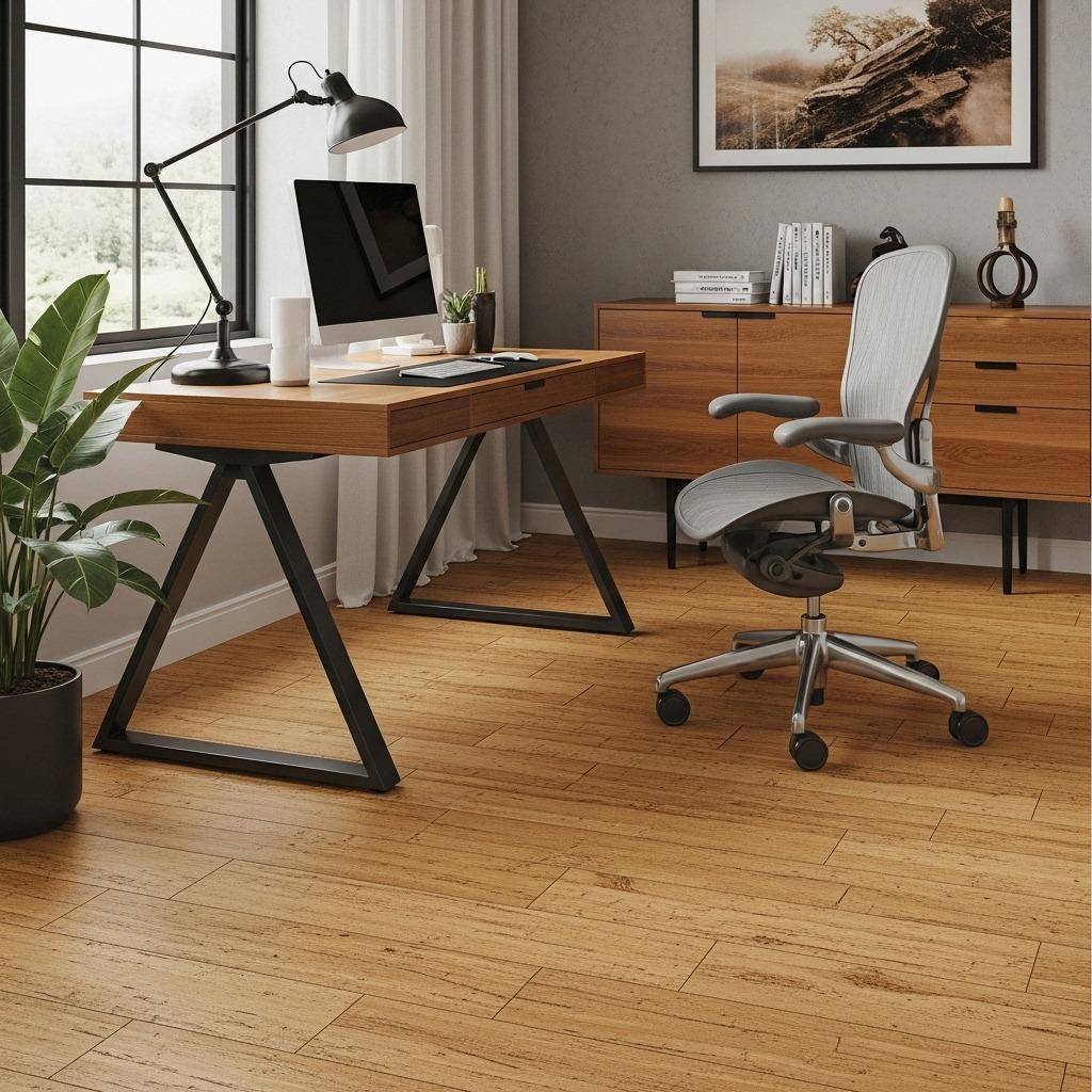This flooring works particularly well in home office remodel projects where you’ll be standing for long periods. It’s also naturally insulating, which helps with both temperature and sound. Seal it properly, and cork holds up well to normal traffic – though you’ll want to avoid it in very wet areas.