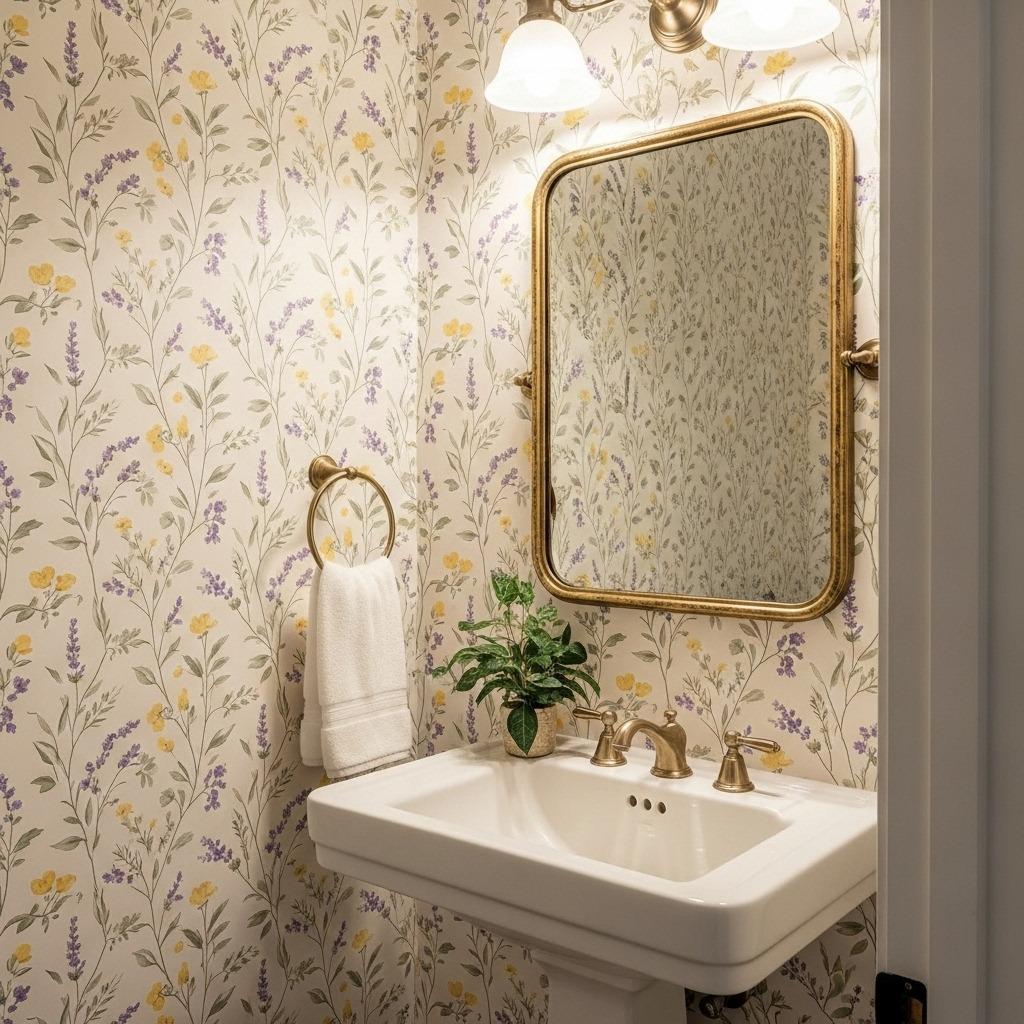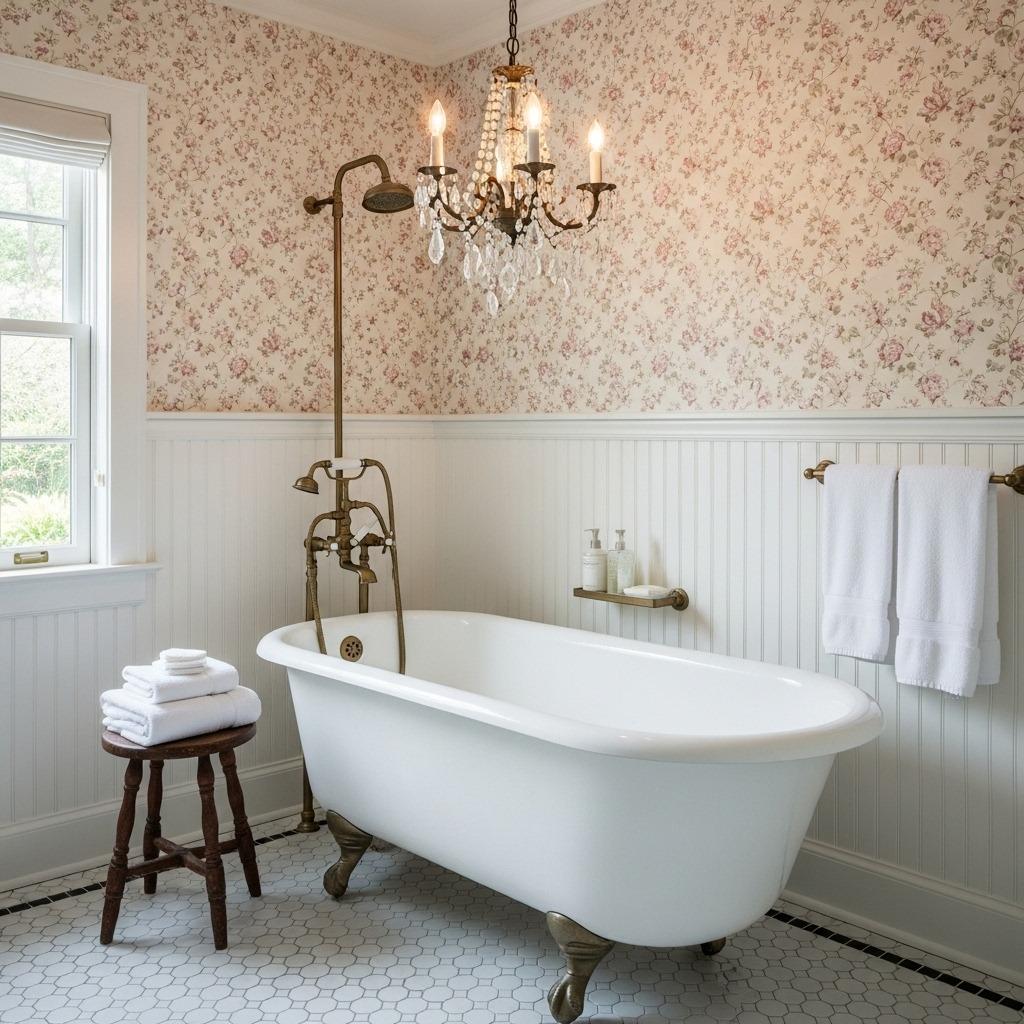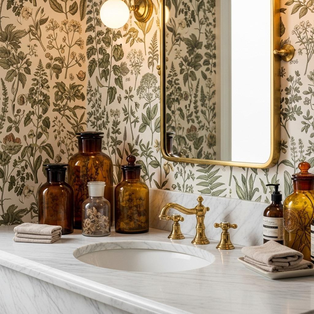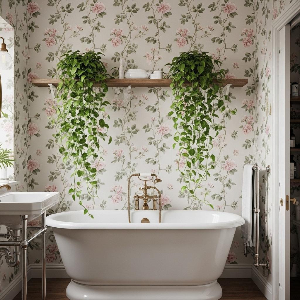This style begs for vintage or farmhouse-inspired fixtures. Think white porcelain, brushed nickel, or oil-rubbed bronze. A freestanding tub would look incredible against a climbing vine backdrop. Add some actual trailing plants on a shelf, and you’ve got layers of botanical beauty.