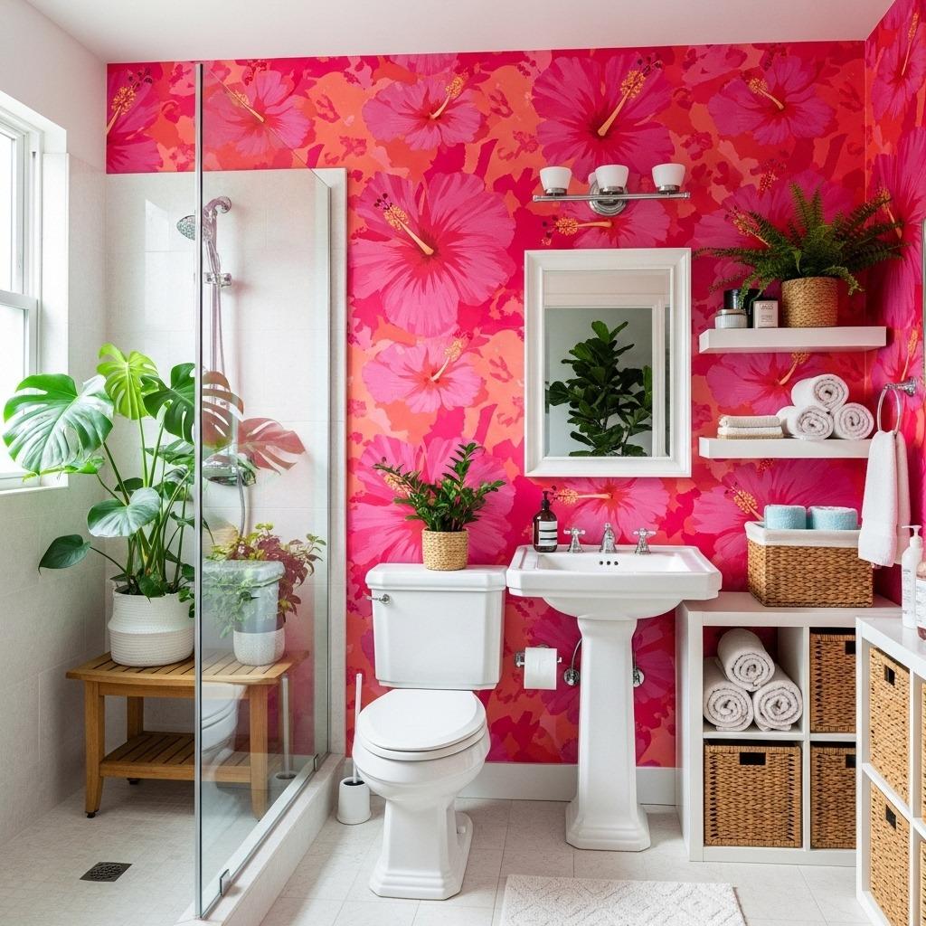 Tropical patterns work best when you embrace the whole theme. Don’t half-commit – add some rattan accessories, maybe a teak bath mat, and definitely some greenery. The goal is making it feel cohesive rather than like you just slapped tropical wallpaper on otherwise suburban walls.