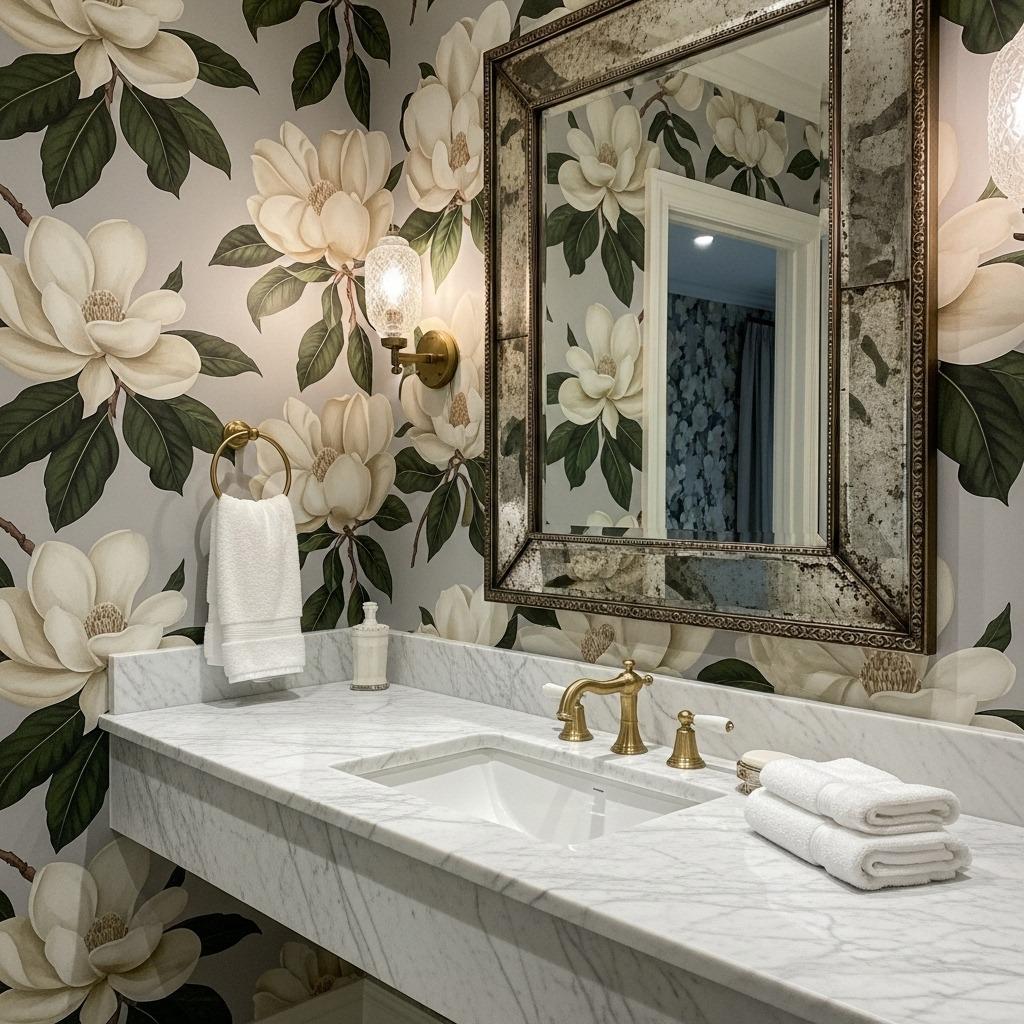 These patterns tend to be bolder and more graphic than naturalistic florals, so they work well as accent walls rather than covering every surface. Behind the vanity or in a water closet area creates impact without overwhelming.