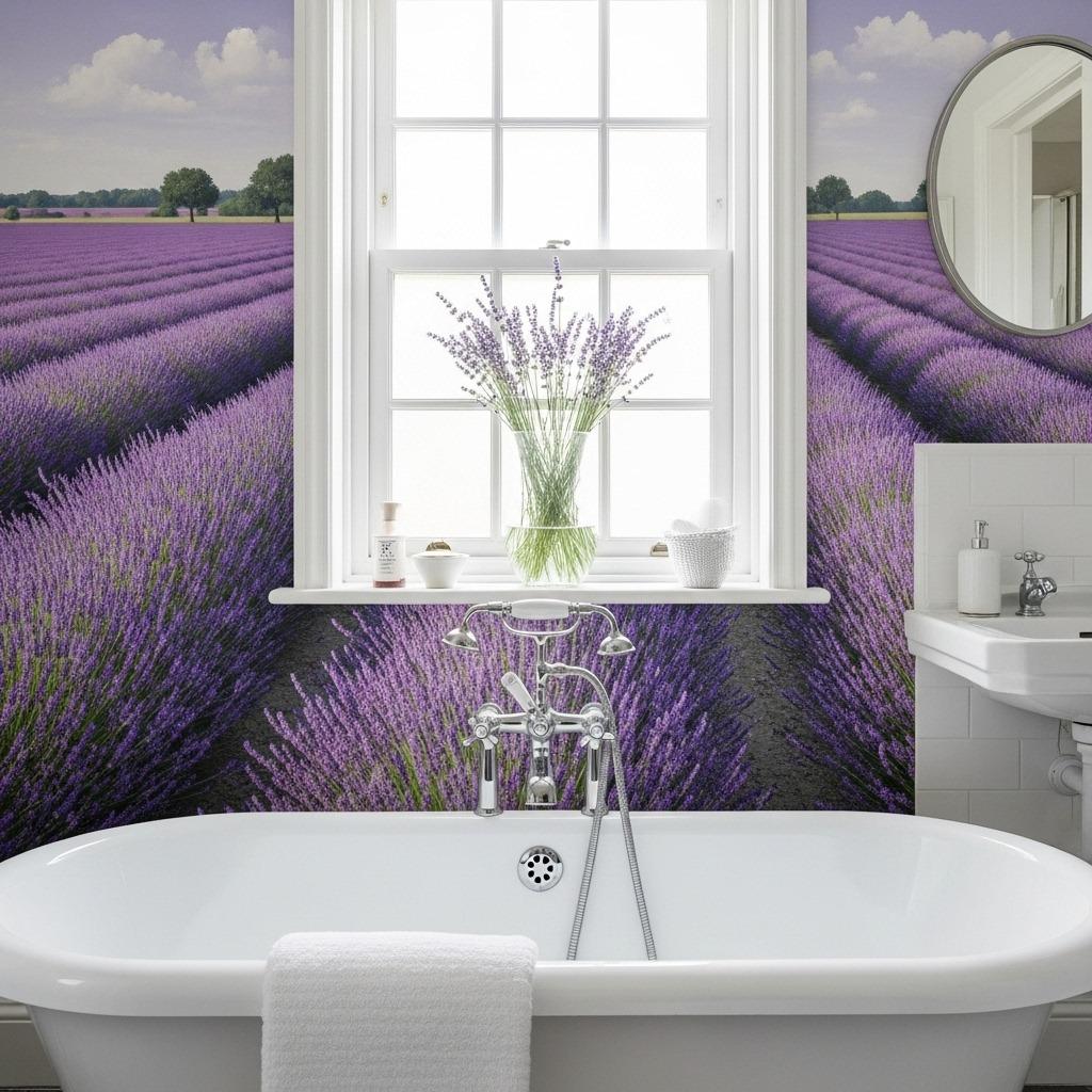 Lavender wallpaper brings the calming properties of the actual plant into your bathroom through visual association. Those familiar purple spikes against soft greens and grays create an immediately soothing atmosphere that’s perfect for unwinding.