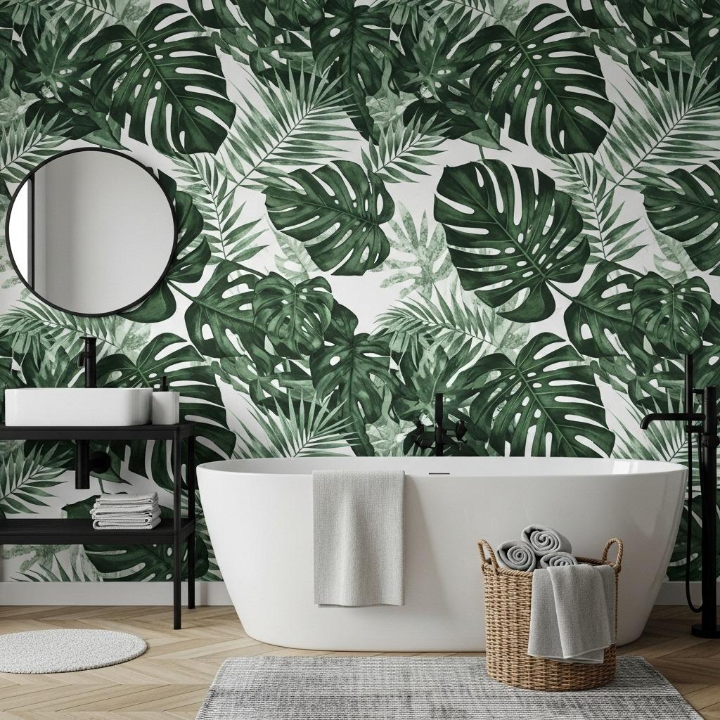 Balance is everything here. Keep your towels, rugs, and accessories in solid colors – whites, blacks, or natural materials like rattan. The wallpaper should be the star, with everything else playing supporting roles.