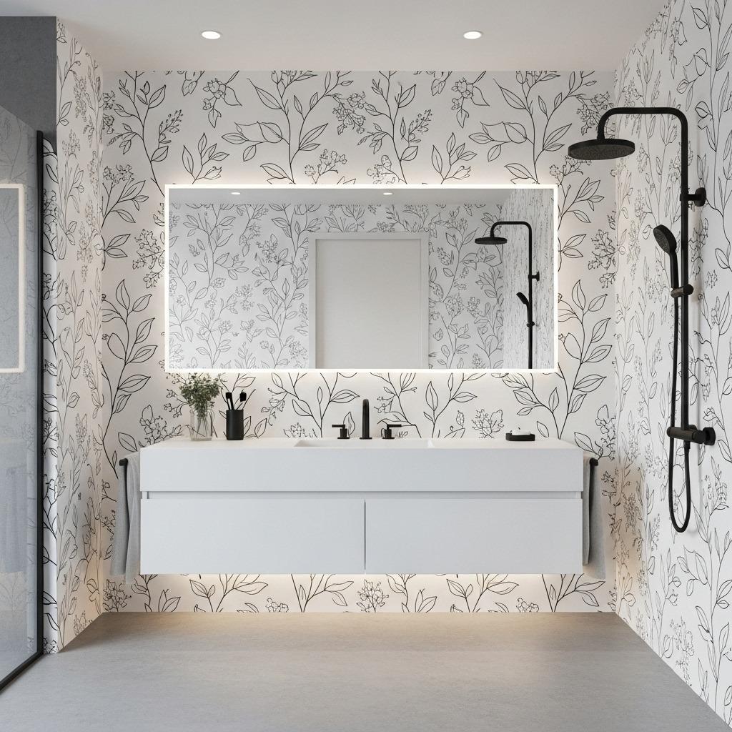 I appreciate how versatile this approach is. It plays nicely with both warm and cool color palettes in your fixtures and accessories. Swap your towels from black to terracotta to sage, and the wallpaper adapts beautifully each time.