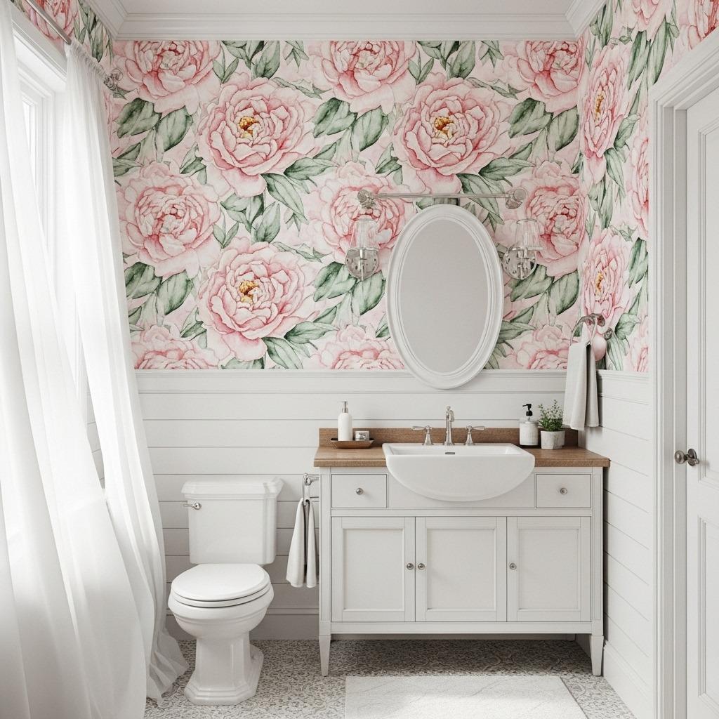 Peonies might be the most romantic flower for wallpaper, especially when rendered in soft watercolor washes. The blurred edges and color blending create an almost dreamy quality that makes your bathroom feel like you’re perpetually in spring.