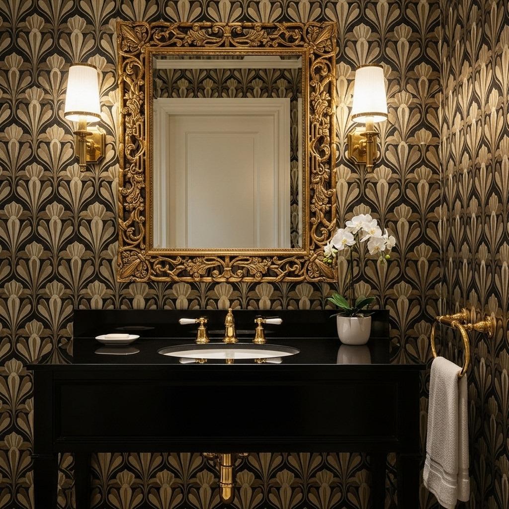 The 1920s glamour vibe works especially well if you’re going for a vintage-modern fusion in your bathroom. Think gold fixtures, geometric tiles, and maybe a vintage-inspired vanity. The wallpaper becomes a bridge between eras, feeling both nostalgic and fresh.