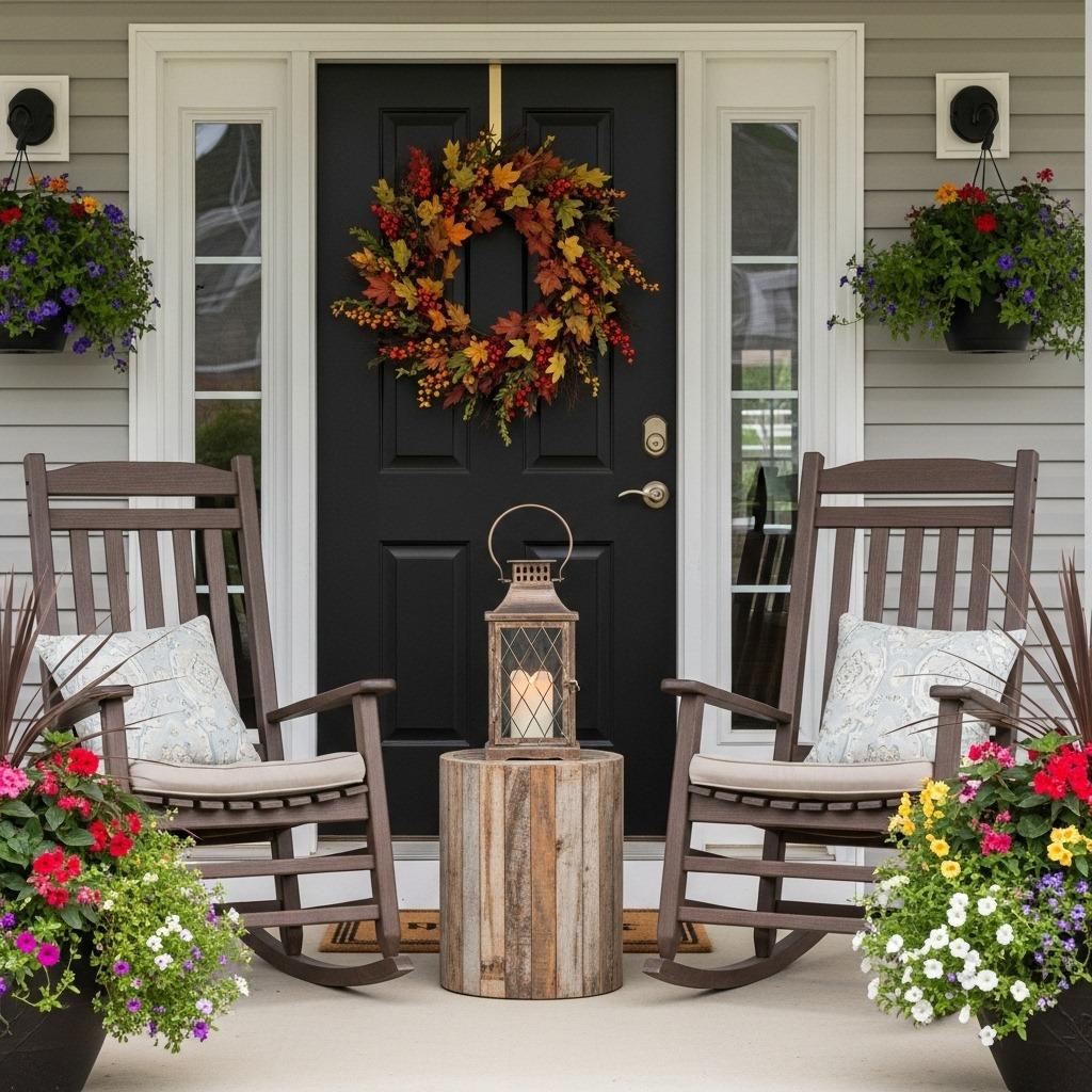 Keep furniture proportional to your porch size. A massive porch swing on a tiny stoop looks ridiculous, while a single small chair on a sprawling veranda feels lonely. Two matching chairs with a small table between them is a classic arrangement that works for most spaces. Add weather-resistant cushions in colors that complement your front door.