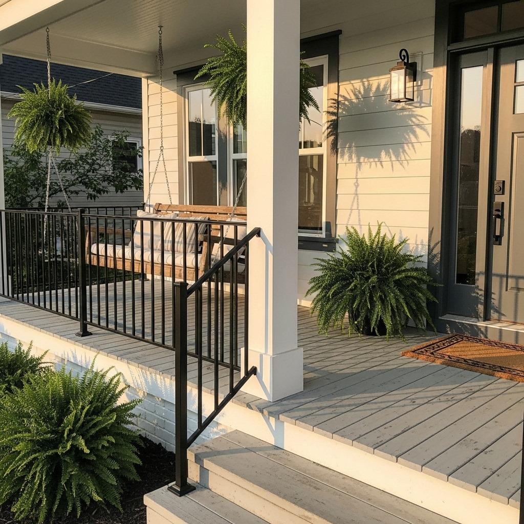 Modern options include low-maintenance materials like aluminum, vinyl, or cable railings that never need painting. Black metal railings with simple designs feel current and versatile. For a more traditional look, painted wood railings in white or a color that coordinates with your trim creates classic appeal.