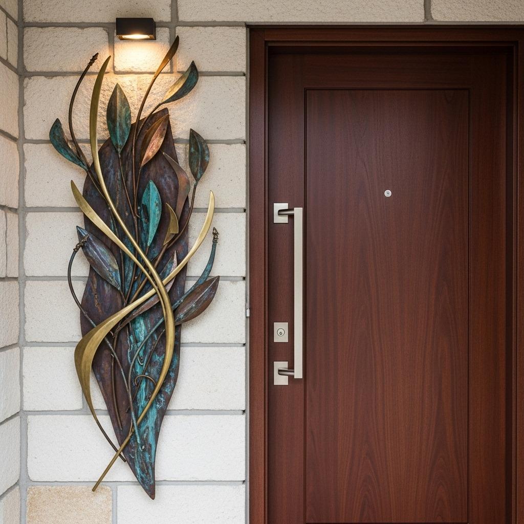 Look for weather-resistant materials like metal, stone, or sealed wood. A statement piece of wall art beside your door creates interest on blank walls. Vintage shutters mounted decoratively, antique windows used as wall decor, or a collection of small planters arranged on steps add curated charm.