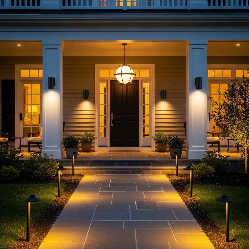 Start with your entryway. Matching sconces on either side of your front door create symmetry and welcome. For front yard design, add low-voltage path lights along walkways or uplights to showcase mature trees and architectural features. Solar options have improved dramatically and eliminate the need for electrical work.