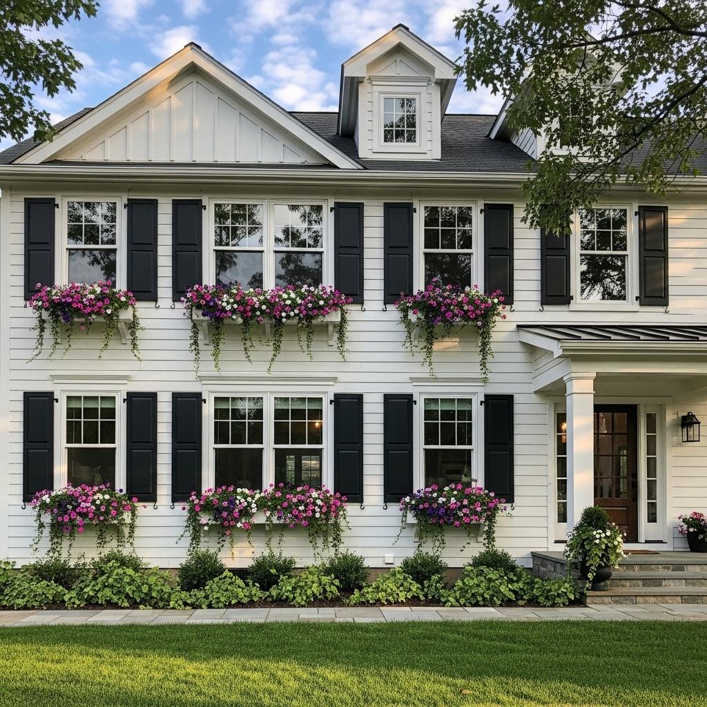 Architectural details like shutters and window boxes add charm and dimension to flat facades. Even if your home’s bones feel plain or builder-basic, these additions create visual interest that elevates the entire exterior.