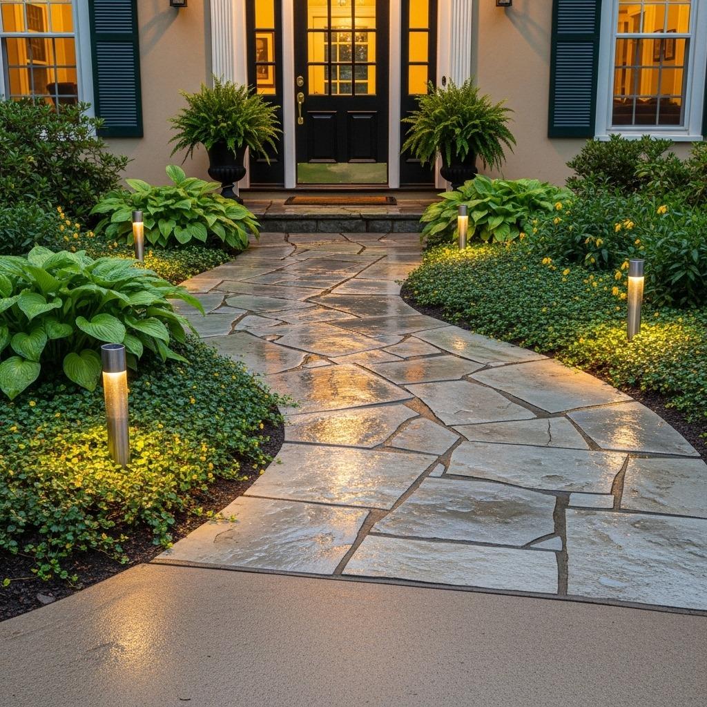 Consider widening your walkway to at least 4 feet if space allows. Materials like natural flagstone, brick pavers, or stamped concrete add texture and interest that plain concrete can’t match. A gently curving path often feels more inviting than a straight shot from sidewalk to door.