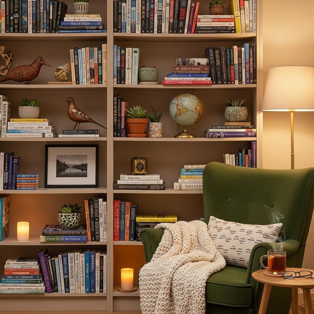 For bonus points, add decorative items with different textures between books. Ceramics, boxes, and fabric items all contribute to sound absorption in different ways. The varied surfaces prevent sound from bouncing cleanly off the wall.