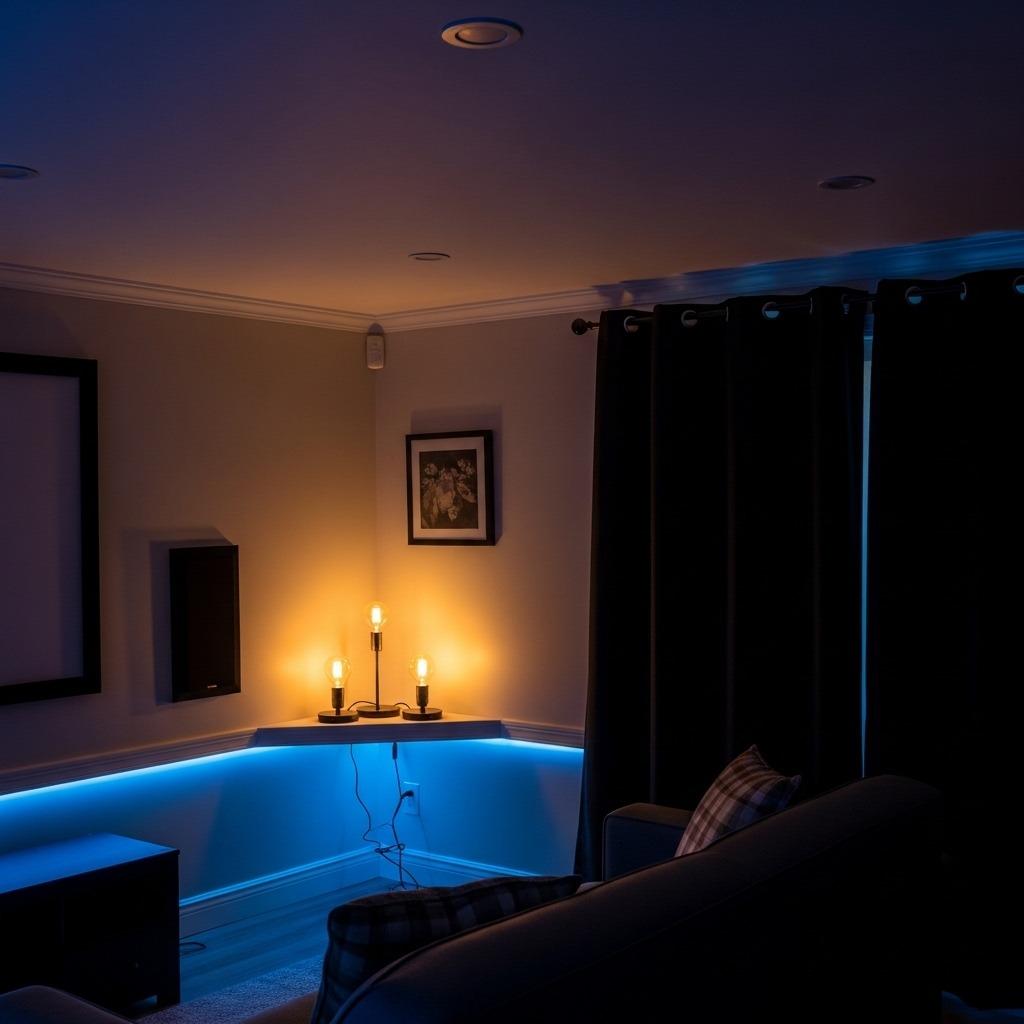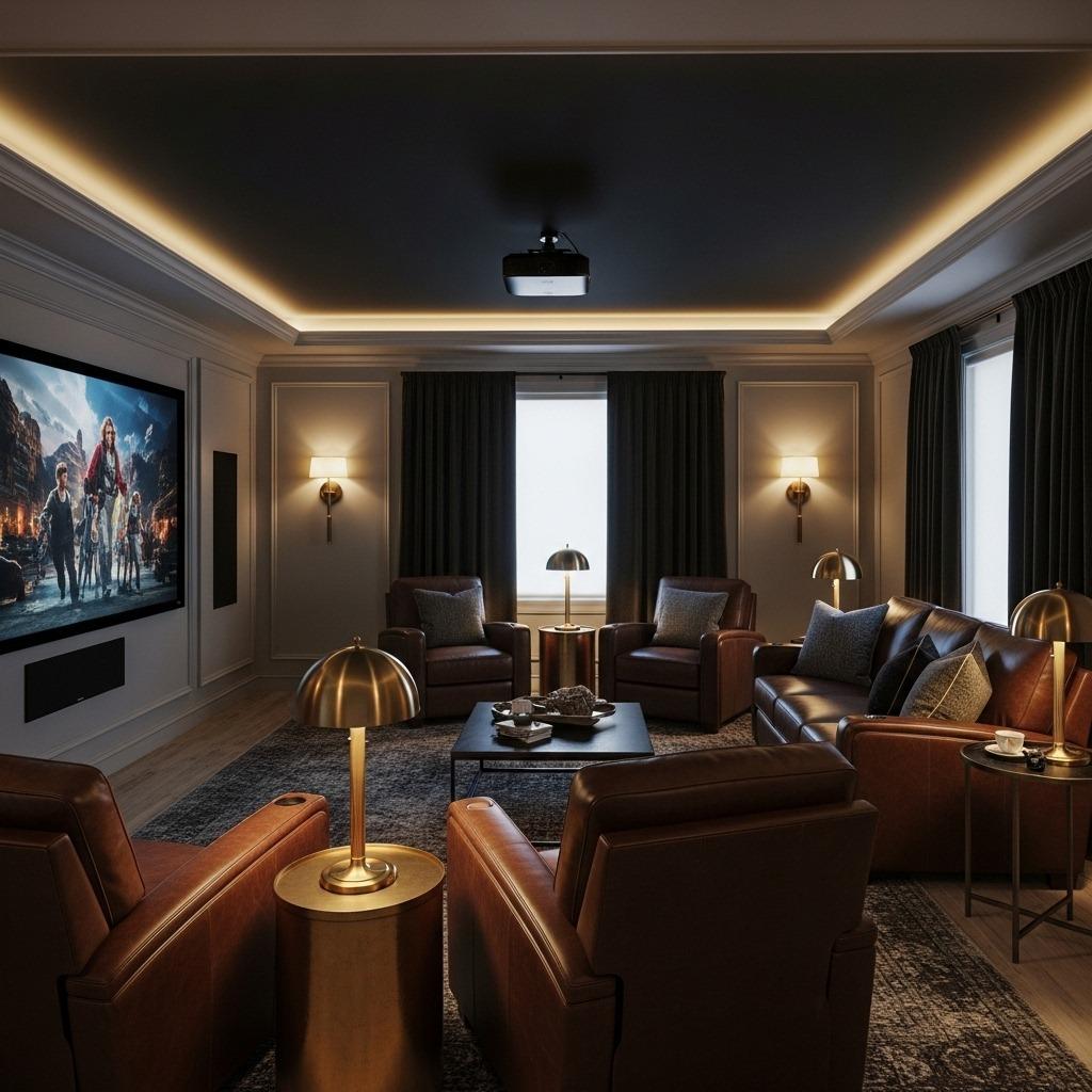 Install dimmer switches on all overhead lights. Add LED strip lighting along baseboards or behind your screen for a subtle glow that won’t compete with what’s on screen but keeps the room from feeling like a cave. Wall sconces with warm bulbs positioned away from the viewing area add sophistication without glare.