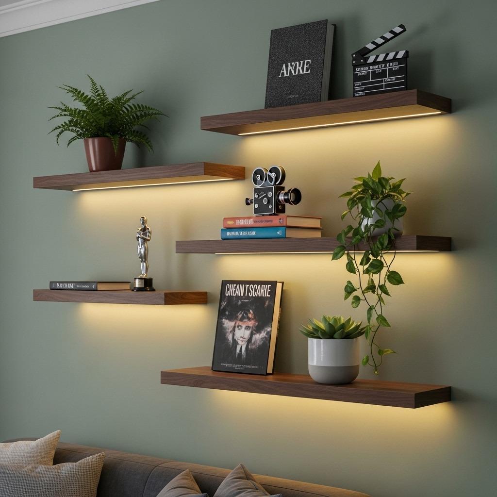 Blank walls around your screen area are an opportunity. Floating shelves add functionality without bulk, giving you space to display movie memorabilia, plants, or books that reinforce the theater style decor vibe.
