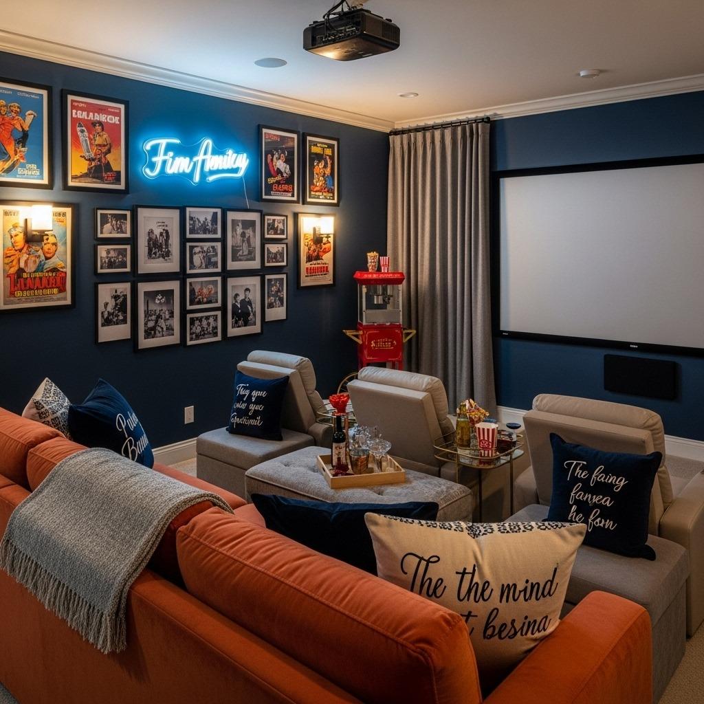 Frame movie posters from films that matter to you, not just what looks cinematic. Commission custom neon signage with your family name or a favorite film quote. Display memorabilia that tells a story – signed DVDs, props, or photos from productions you care about. Check out creative living room gallery wall ideas that can inspire your theater decor.