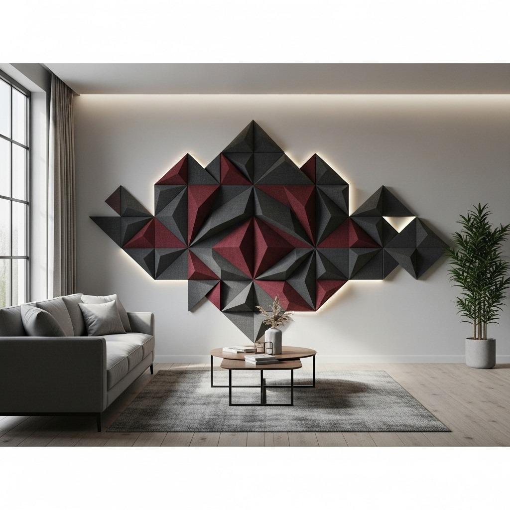 Choose fabric-wrapped panels in colors that complement your space. Arrange them in patterns – a grid, scattered asymmetrically, or even in a geometric design that reads as wall art. Some companies offer custom prints on acoustic fabric, so you could incorporate photography or abstract designs.