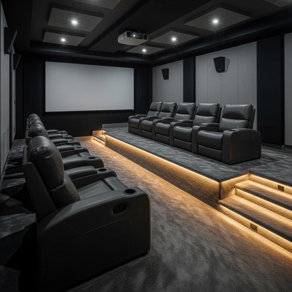 Add LED lighting along the step edges for safety and ambiance. When the lights go down, that subtle glow guides movement without disturbing the viewing experience. It’s a small detail that feels expensive and thoughtful.