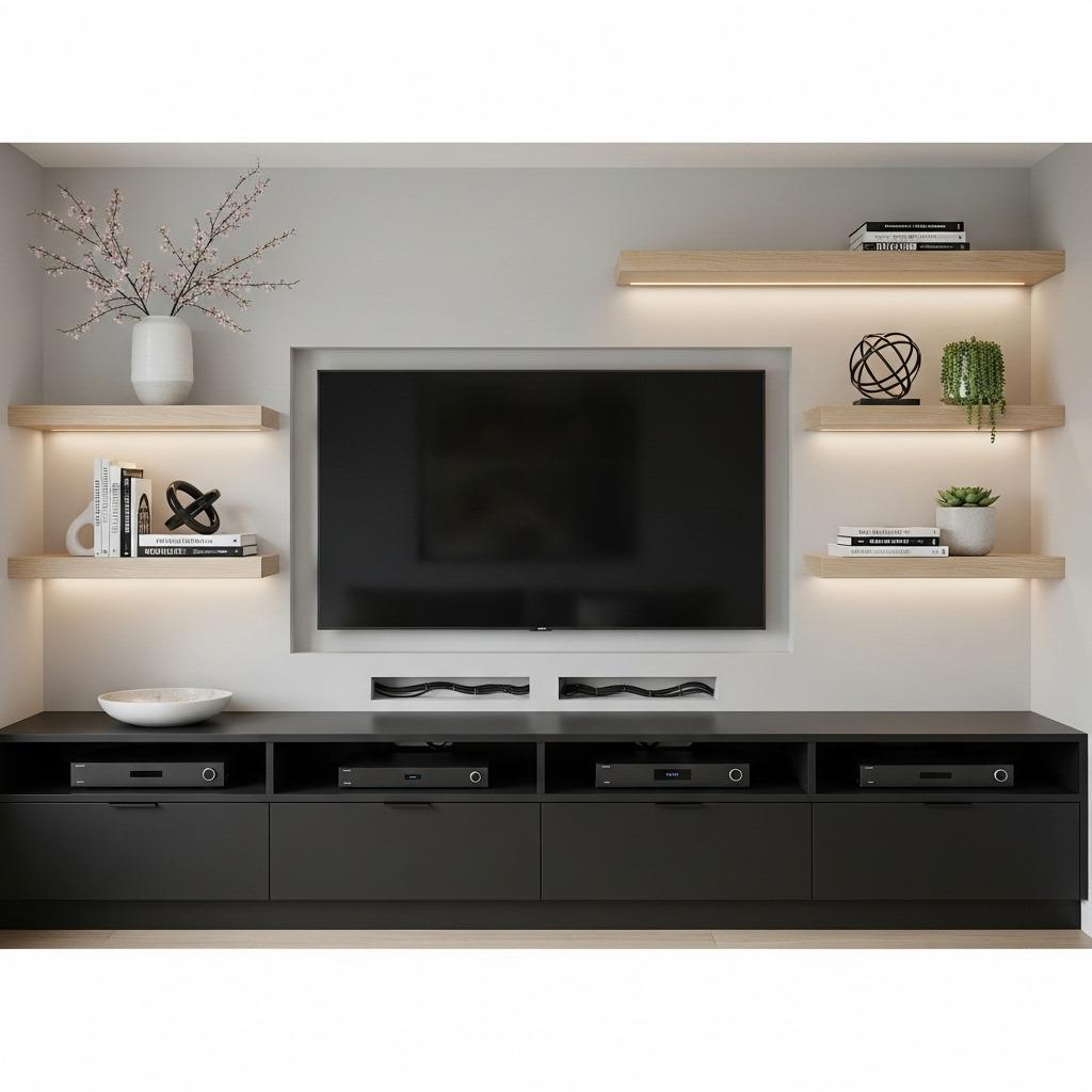 Keep them simple and streamlined – chunky traditional shelves can feel cluttered. Thin floating shelves in wood or metal tones that match your other fixtures work best. Position them away from the immediate screen area to avoid distraction but within the room’s sightlines.