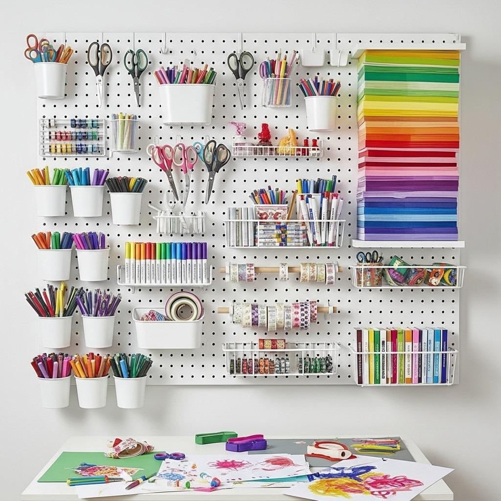 Color-code supplies by type or project. Group all painting supplies in one zone, paper crafts in another, and drawing tools in a third. This organization system teaches categorization skills while making cleanup straightforward. The pegboard itself becomes a focal point, especially when you paint it an accent color.