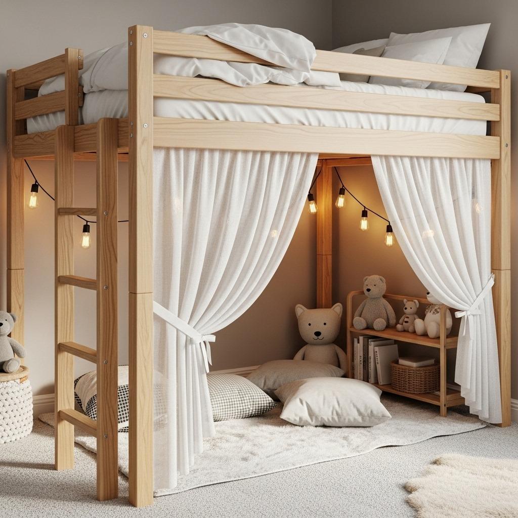 Loft beds aren’t just about saving floor space. They create magical underneath zones perfect for hideaways, study nooks, or miniature playrooms. Outfit the lower area with string lights, cushions, and curtains that your child can open or close depending on their mood.