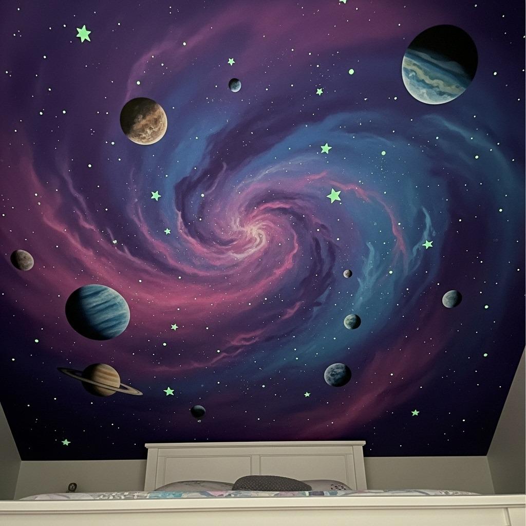 The execution matters here. Stick to deep blues, purples, and blacks rather than garish neons. Add planets, constellations, or even a shooting star trail across one corner. The mural becomes a talking point for discussions about space, science, and dreaming big.