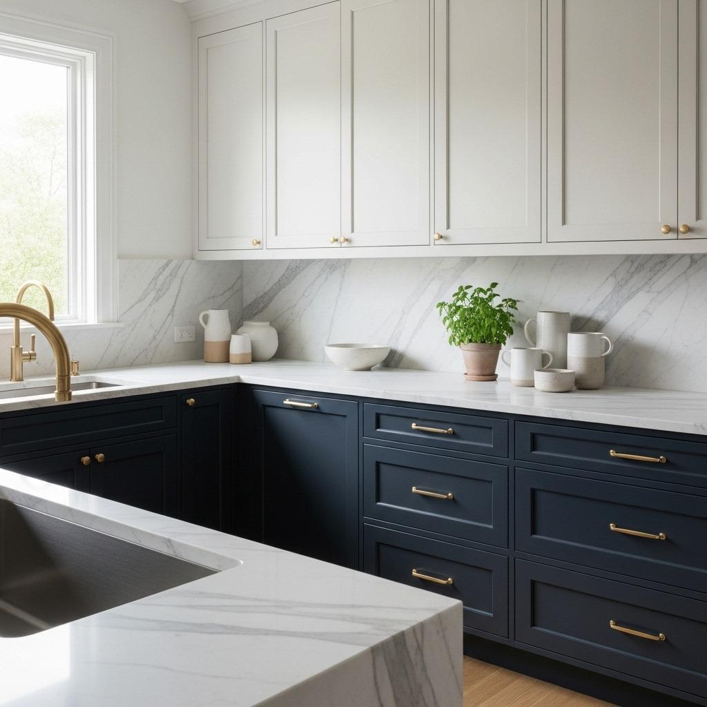 Pairing light upper cabinets with darker lowers grounds the space while keeping it airy. Think crisp white or soft cream on top with navy, forest green, or charcoal below. This approach works beautifully in both traditional and contemporary settings.