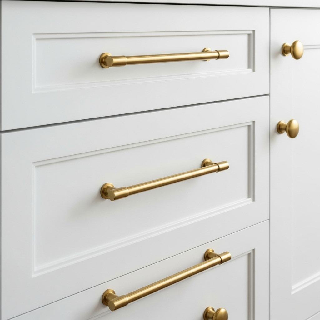 Brass, matte black, polished nickel, and even leather-wrapped pulls are trending. Mixing metals – like brass knobs with black pulls – adds unexpected interest. The key is keeping the combination intentional rather than random.