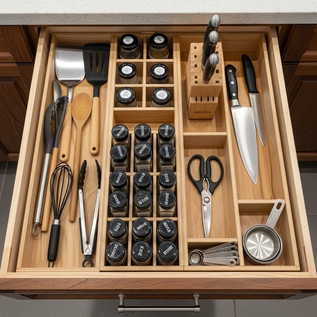 Modern cabinetry isn’t just about looks. Built-in organizational features transform how well your kitchen functions.