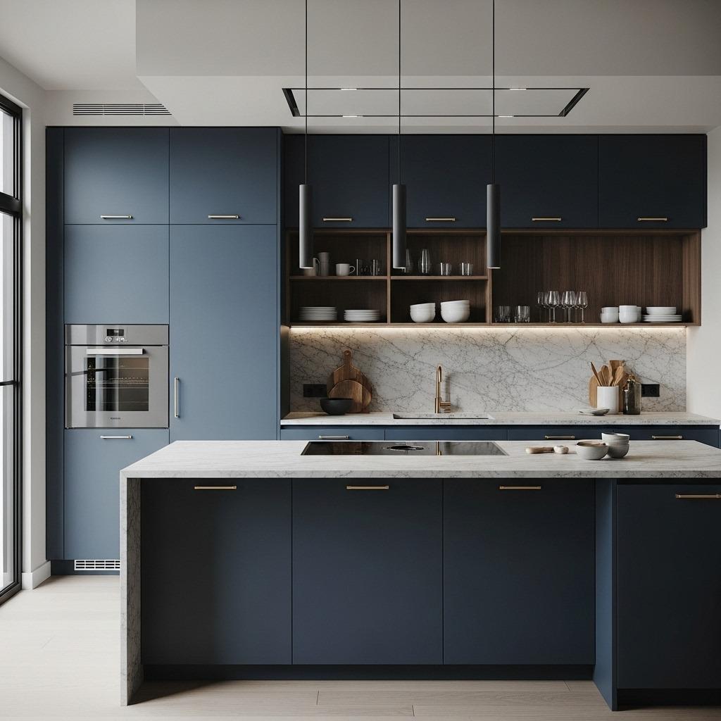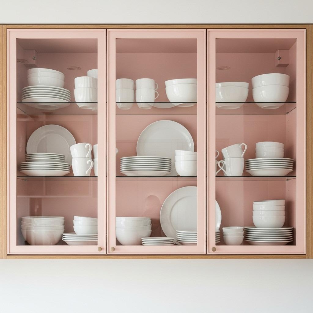 Soft pastels, bold jewel tones, or even metallic finishes turn the inside of glass-front cabinets or open shelving into a design feature. This detail feels luxurious and intentional, like a hidden surprise for those who know to look.