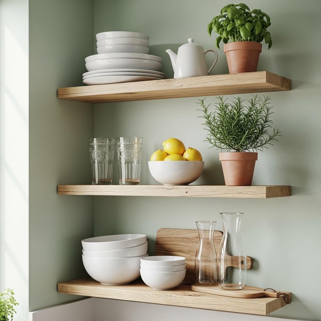 Replacing one or two upper cabinets with open shelves creates display opportunities for items you actually use and love. Think everyday dishes, favorite cookbooks, or a small collection of pottery. It makes your kitchen feel more lived-in and personal.