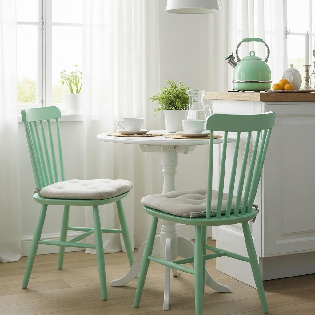 The trick with mint is using it sparingly but intentionally. Too much mint can feel juvenile or overly themed. Instead, scatter it throughout the space – maybe mint towels, a mint-framed mirror, and one larger mint piece like a chair or small cabinet. This creates rhythm and visual interest without turning your kitchen into a mint museum.