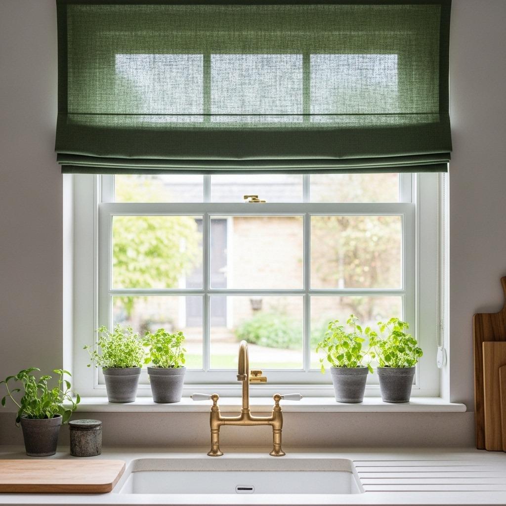 Window treatments are one of the most overlooked opportunities to add green to a kitchen. Forest green curtains, Roman shades, or even a simple valance introduce color at eye level where it makes an impact. The darker tone provides privacy while still allowing natural light to filter through.